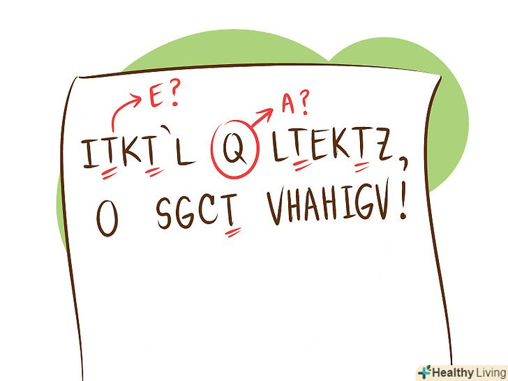 Шукайте найбільш часто вживані символи і букви.наприклад, в англійській мові такими є" e"," t "і"a". Працюючи з шифром, використовуйте своє знання мови і структури пропозицій, на основі чого робіть гіпотези і припущення. Так, на всі 100% ви рідко будете впевнені, але розгадування шифрів-це гра, де від вас вимагається робити здогади і виправляти власні помилки!- Подвійні символи і короткі слова шукайте в першу чергу, намагайтеся почати розшифровку саме з них. Легше, як ніяк, працювати з двома літерами, ніж з 7-10.