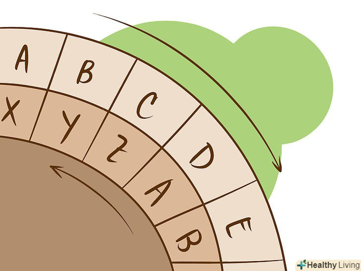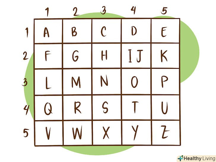 - Шифруючі також використовують спеціальні кодові слова щодо конкретних колонок для кожної букви в зашифрованому повідомлень. Наприклад, якщо кодове слово - це "wikihow", то діяти треба так: треба дивитися w-ряд і колонку першої літери зашифрованого коду, щоб дізнатися першу букви повідомлення. Такі шифри складно розгадати, не маючи на руках кодового слова.[5][6]