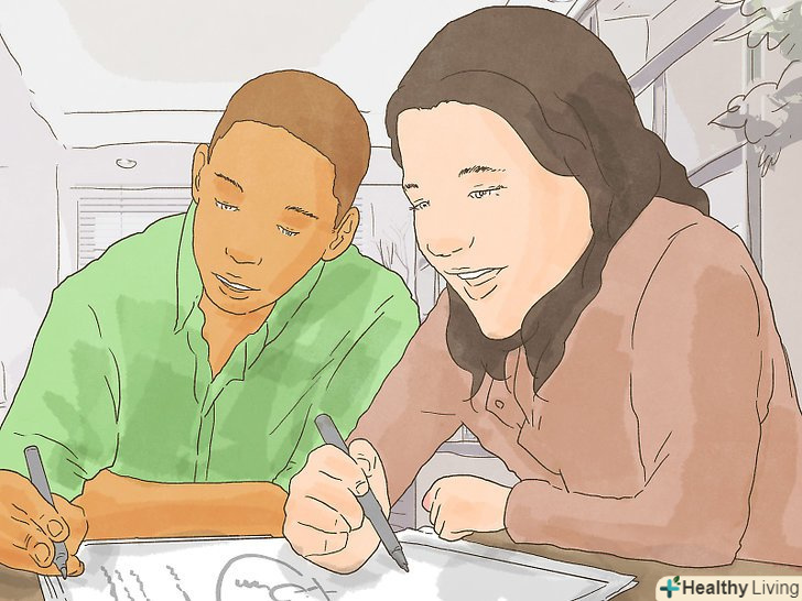 Знайдіть партнерів з навчання зі схожими звичками.ближче познайомтеся з людьми з вашого класу і знайдіть час поцікавитися їх методами навчання. Шукайте потенційного партнера з навчання, який любить займатися приблизно в той же час дня, що і ви, і який використовує подібні методи навчання. Запитайте, чи не хоче він іноді вчитися разом з вами. Це зробить процес навчання менш ізольованим і нудним.[9]- Наприклад, якщо ви віддаєте перевагу займатися в бібліотеці ночами (якщо є така можливість), пошукайте партнера по навчанню, який робить те ж саме.