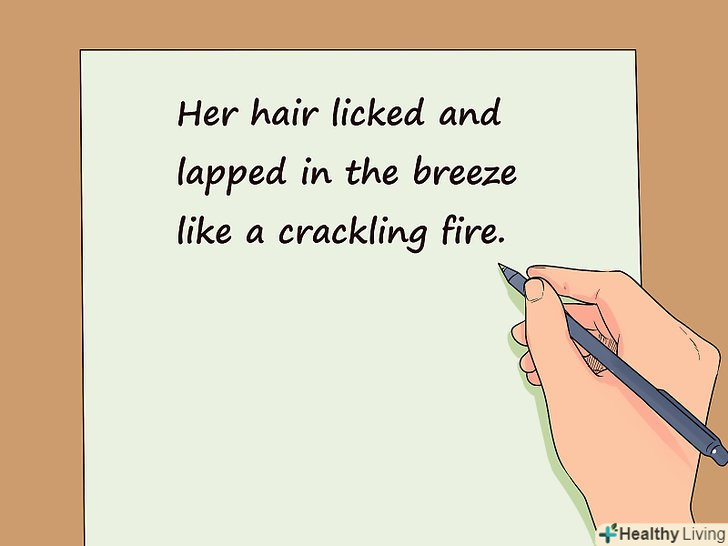 Використовуйте образну мову поряд з змістовними деталями.покладайтеся на мову, яка пробуджує фізичний вигляд людини, а також суворо дотримуйтеся описових фраз. Це творча частина креативного письма![17]- Замість того, щоб писати: «у неї були довгі руде волосся», — можна використовувати такий варіант: «її колишуться на вітрі волосся нагадували полум'я вогню, потріскує в каміні».