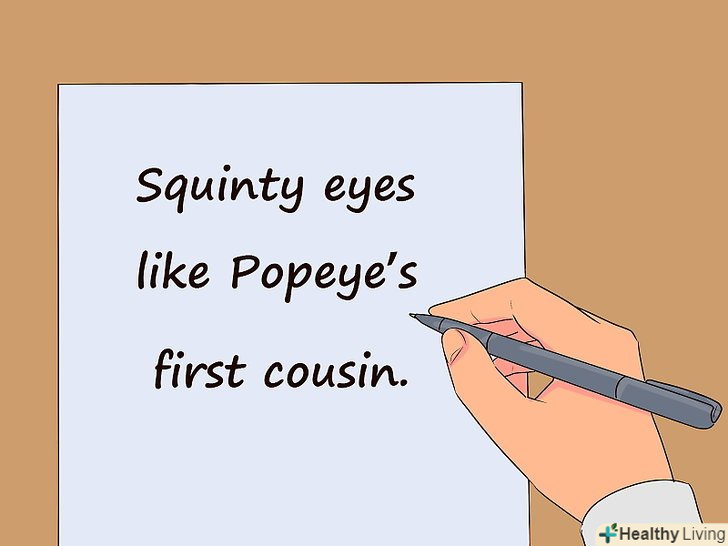Опишіть людину таким чином, щоб вона відповідала тону письма.наприклад, якщо ви пишете в гумористичному стилі, використовуйте гумористичну мову. Якщо ж сцена напружена і драматична, пропустіть дурні метафори в описах.[18]- Наприклад, розглянемо різницю між описом» неначе вирізані ножем щілини очей «і»косоокість, як у двоюрідного брата Дениса".