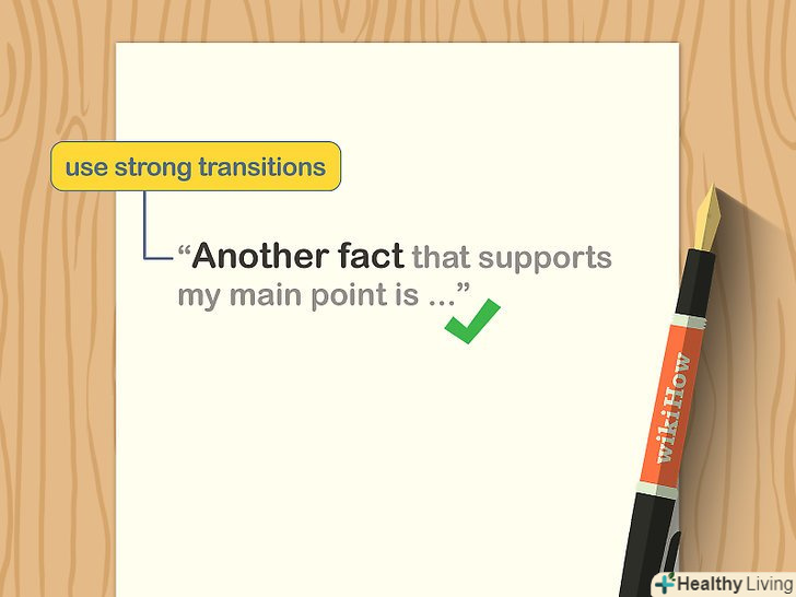 Використовуйте переходи для спрощення сприйняття. переходи покращують плавність мови, а також допомагають побачити зв'язок між тезами. Переходи не завжди помітні, коли ви читаєте і пишете Тексти, але їх відсутність відразу впадає в очі. Переконайтеся, що ви використовували в мові різні переходи. Приклади: [9]- Далі;