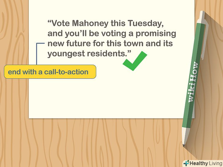 Завершіть промову закликом до дії.у міру наближення до завершення слухачі повинні бути захоплені темою і готові вжити заходів. Мотивуйте людей дізнатися більше і взяти участь у вирішенні описаної проблеми словами про те, як вони можуть це зробити. Це хороша можливість поділитися ресурсами і задати напрямок.[10]- Наприклад, якщо ви описали вплив глобального потепління на чисельність білих ведмедів, то завершите мова розповіддю про тих некомерційних організаціях, які займаються захистом навколишнього середовища і популяції білих ведмедів.