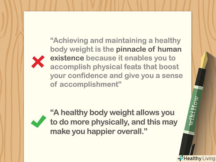 Використовуйте короткі та прості слова та речення.громіздкі слова замість рівнозначних простих синонімів можуть відлякати слухачів. Довгі і складні речення можуть збивати з пантелику і приводити до плутанини. У більшості випадків слід використовувати просту мову. Так, єдиним винятком будуть ситуації, коли думка або ідею просто неможливо висловити інакше.[11]- Наприклад, замість фрази: "здатність досягти і зберігати здорову вагу є апофеозом людського існування, так як вона дозволяє демонструвати чудеса спритності, які підвищують впевненість в собі і дарують почуття задоволення», — краще сказати: «завдяки здоровій вазі ви станете сильніше, витривалішими і відчуєте себе щасливою людиною».