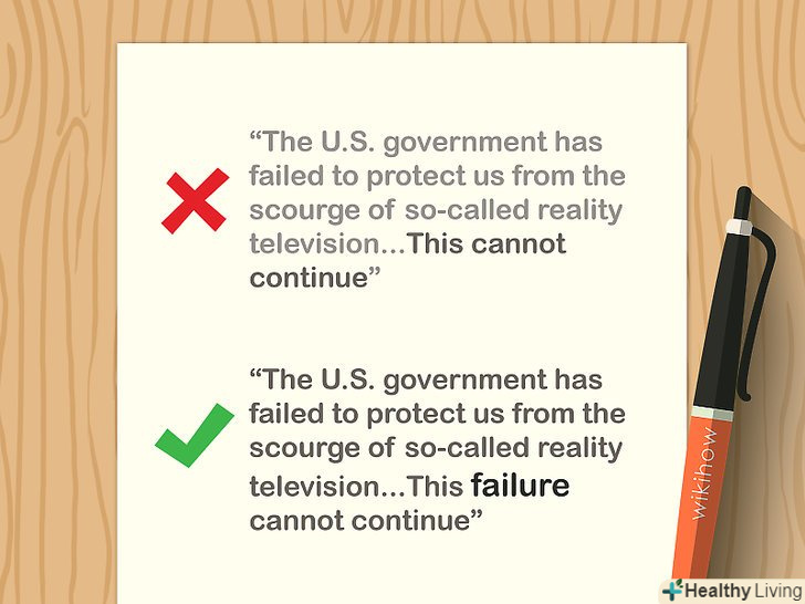 Не замінюйте іменники займенниками для граничної ясності.звичайно, іноді можна використовувати займенник, особливо в спробі уникнути багаторазових повторів. Проте занадто велика кількість займенників завадить слухачам стежити за вашими доводами. По можливості віддавайте перевагу іменам власним (назви місць або речей, імена) і не зловживайте займенниками. Приклади поширених займенників:[13]- Це;