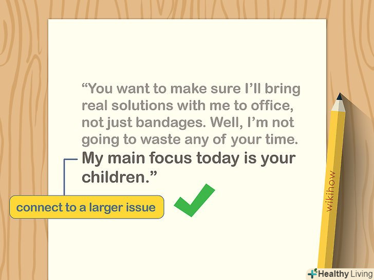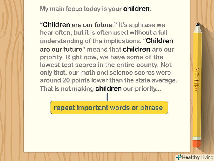 Повторюйте слова і фрази кілька разів.повторення-ефективний прийом в будь-якій мові. Якщо багаторазові повтори різних слів можуть відволікати, то повторення конкретного слова або фрази кілька разів допоможе надати вашому доводу чітку форму і захопити слухачів.[14]- Наприклад, якщо ви вимовляєте промову перед групою торгових представників, які бажають збільшити продажі нового продукту під назвою "Синергія", можна повторювати просту фразу на кшталт: "розповідайте покупцям про "синергії"" або вимовити слово "Синергія" кілька разів протягом мови, щоб нагадати слухачам про продукт.