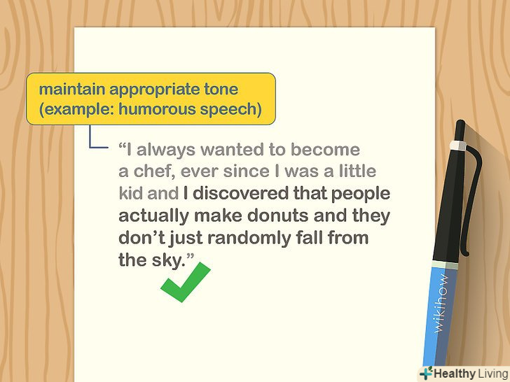 Підтримуйте доречний тон мови. Тон-це загальний настрій вашої мови, яке може варіюватися від серйозного до жартівливого або від розміреного до поспішного. Вибір слів і вимова впливає на тон мови.[16]- Наприклад, якщо ви описуєте свою любов до їжі в мотивуючій промові про те, як ви стали шеф-кухарем, то можна використовувати жарт і сказати: «я хотів стати шеф-кухарем ще з дитинства, коли раптом виявив, що печиво не з'являється в коробці за помахом чарівної палички, а його готують люди».