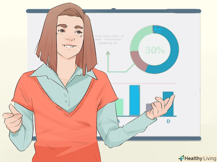 Використовуйте наочні засоби, якщо допустимо.презентація в програмі PowerPoint зовсім не є обов'язковою умовою для гарної мови, але вона допоможе слухачам стежити за вашими словами, особливо при поясненні складних ідей. Також можна використовувати слайди, щоб наочно продемонструвати ключові концепції за допомогою зображень, секторних діаграм і цитат.[17]- При цьому не варто надмірно покладатися на слайди. Вам все одно потрібно буде вимовити захоплюючу промову і зацікавити слухачів. Слайди повинні лише доповнювати сказане.