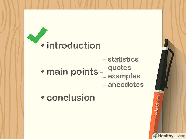 Складіть планЗ твердженнями і доводами.структуруйте свої ідеї і знахідки у вигляді плану, щоб заздалегідь перевірити повноту і послідовність інформації. Як правило, мова включає введення, п'ять основних тез з підтверджуючими доказами (статистика, цитати, приклади, випадки з життя) і висновок. Використовуйте пронумерований або маркований список.[2]- Якщо потрібно написати інформативну або переконливу мову, то використовуйте структуру у вигляді проблеми і рішення. Спочатку опишіть суть проблеми і в другій частині поясніть, як її можна вирішити.[3]