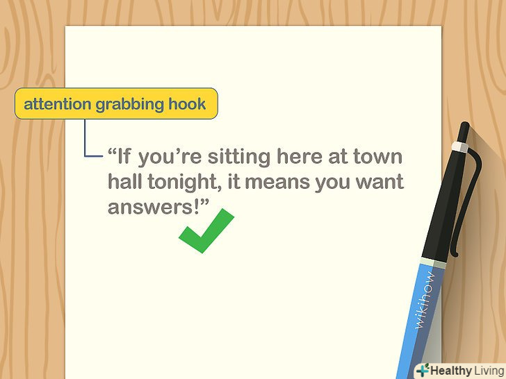 Повідомте цікавий факт, щоб відразу привернути увагу слухачів.перша фраза вашої мови може виявитися найбільш важливою, так як в цей момент присутні вирішують, чи варто Вас Слухати. Залежно від теми і цілей мови можна повідомити що-небудь веселе, сумне, лякаюче або шокуюче, щоб заінтригувати слухачів.[4]- Наприклад, якщо потрібно написати мотиваційну промову про схуднення, то можна сказати: «П'ять років тому я не могла пройти і одного сходового прольоту, щоб не зупинитися для перепочинку».