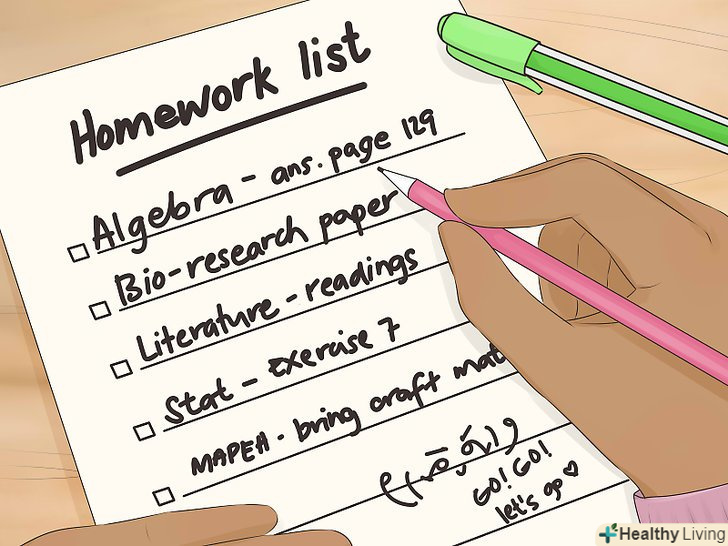Запишіть домашню роботу списком.можна користуватися звичайним щоденником і записувати всі завдання тільки туди - так вам буде простіше знаходити потрібні записи. Деяким учням більше подобаються щоденники або календарі. Використовуйте те, що Вам зручніше, і зберігайте завдання в одному місці.- Часто учні записують домашнє завдання в робочому зошиті вгорі сторінки або роблять позначку олівцем в підручнику. Якщо у вас є така звичка, потім слід все одно переписувати всі завдання в щоденник, щоб ви не забули зробити їх.