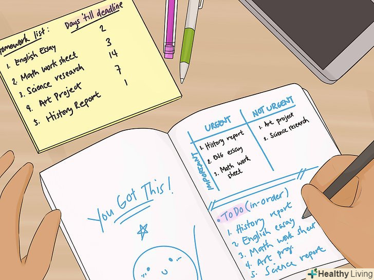 - Спробуйте почати з найважливіших завдань. Домашня робота з математики може бути складною, але якщо ви знаєте, що контрольна ще не скоро, а великий проект з астрономії потрібно здавати вже післязавтра, краще приділити більше часу проекту.