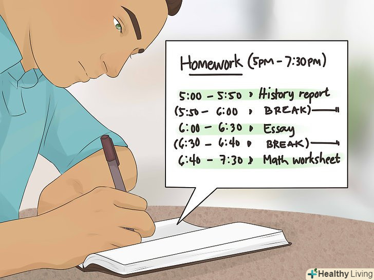 Робіть перерву щогодини.виділіть час на відпочинок і дотримуйтеся плану. Під час перерви можна займатися будь-якими справами, але важливо не забувати про час. Ви можете почати займатися чимось цікавим і передумаєте повертатися до домашньої роботи!- Подумайте, що Вам підходить більше. Одним зручніше робити домашню роботу відразу після повернення зі школи, щоб скоріше закінчити, а інші вважають за краще відпочити якийсь час, щоб прийти в себе після важкого дня.