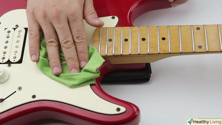 Візьміть тканину без ворсу і протріть нею гітару.Витратьте цей час на те, щоб прибрати з грифа гітари весь пил, сміття і бруд. Це робиться для того, щоб випадково не забруднити нові струни, надати вашій гітарі охайний вигляд і зробити гру на ній більш «швидкою». Для більш глибокого очищення купіть пляшечку очищувача для ладів в місцевому магазині музичних інструментів.