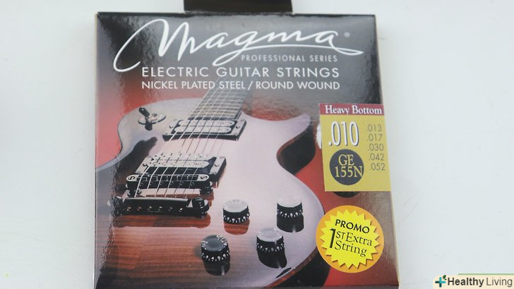 Купуйте відповідні Струни для своєї гітари.у 95% випадків варто брати "легкі" струни або просто струни стандартної ваги. Незважаючи на те, що деякі гітаристи використовують більш важкий калібр і гібридні Набори струн, не можна просто взяти струни, які не підходять для вашої гітари. Без належного регулювання занадто важкі струни здатні деформувати або навіть погнути гриф, так що дотримуйтеся стандартних струн, поки краще не ознайомитеся зі своєю гітарою.- Як правило, товщина 1-ї струни повинна становити 0.008-0.0011 дюйма. Це стосується середніх, легких і дуже легких струн.