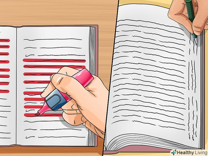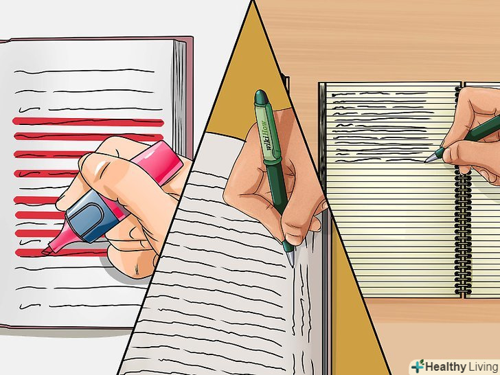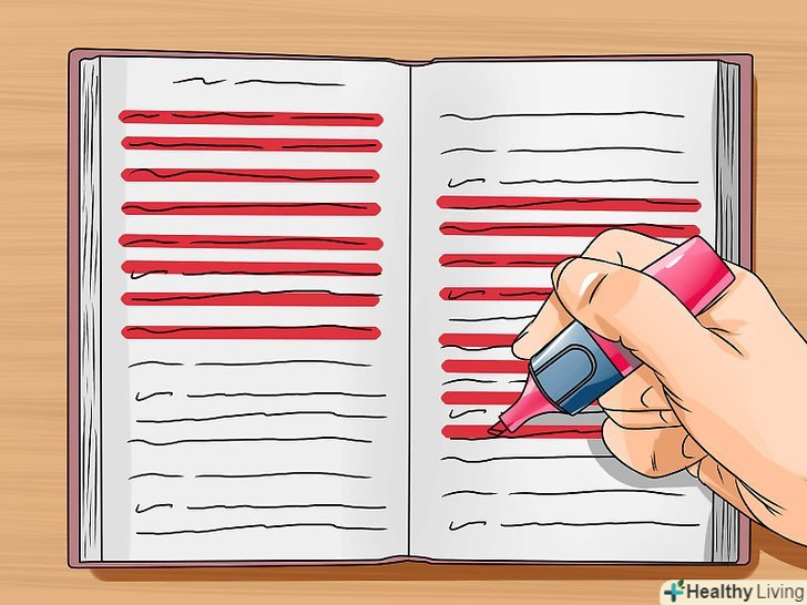 Виділяйте текст.якщо це ваш підручник (ви не позичили його і не взяли в бібліотеці), то можна виділяти в ньому текст. Уважно вивчіть рекомендації для правильного виділення інформації.- Не виділяйте текст і не робіть записи під час першого прочитання. Це порушує потік розуміння і може призвести до того, що ви підкреслите непотрібні відомості.
