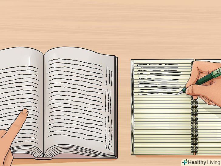 Робіть записи.у навчальному зошиті слід записувати основні ідеї прочитаного уривка своїми СЛОВАМИ. Дуже важливо вести записи своїми словами.- Якщо ви не будете бездумно переписувати текст з підручника, то зможете уникнути плагіату під час написання контрольної роботи і будете впевнені, що дійсно зрозуміли прочитаний матеріал.[7]