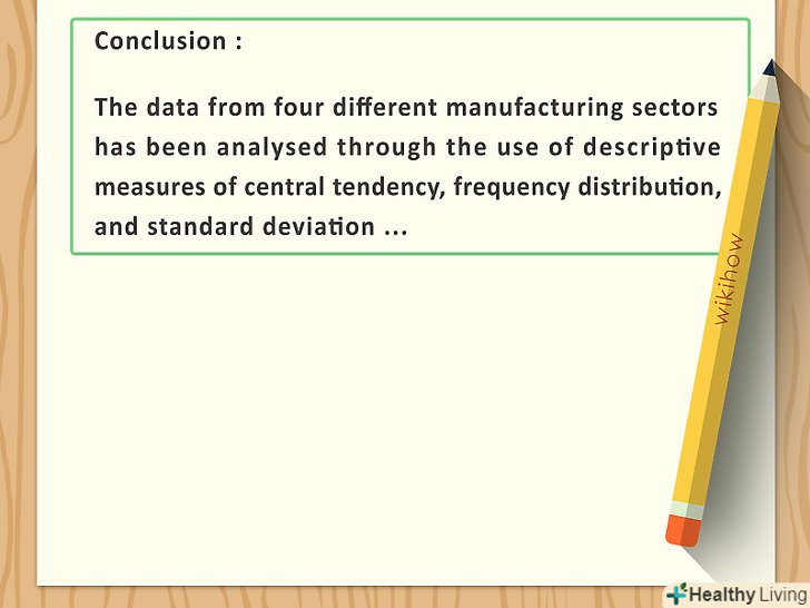 Напишіть висновок.у висновку не слід обмежуватися повторенням вищевикладеного матеріалу: вам потрібно знову підкреслити важливість результатів за допомогою інших формулювань. Також можна порекомендувати інші методи дослідження.[7]- Як і у всьому коментарі до інформаційного тексту, у висновку слід наводити посилання на конкретні блоки даних.