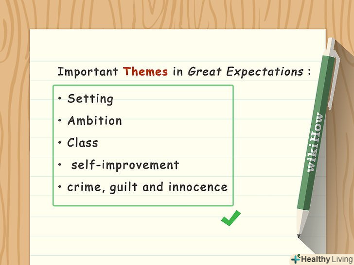 Підкріплюйте тезу конкретними прикладами. заявіть про тему, вкажіть відповідне місце твору і поясніть наслідки або вплив даної теми або проблеми на твір. Наприклад, можна порахувати, що одержимість міс Хевішем ідеєю втраченої любові є важливою темою роману великі надії.- Відмінним прикладом для ілюстрації даної теми стане той факт, що персонаж продовжує носити вінчальну сукню всупереч тому, що її кинули багато десятиліть тому.