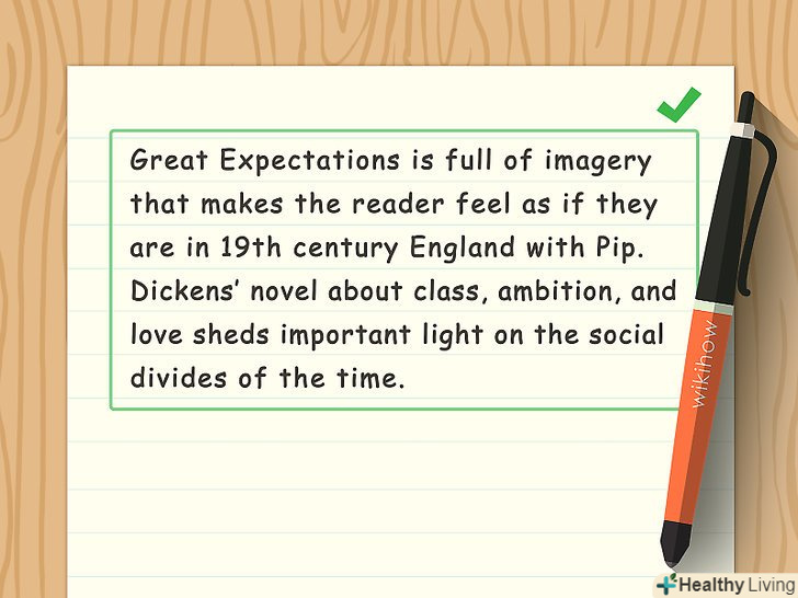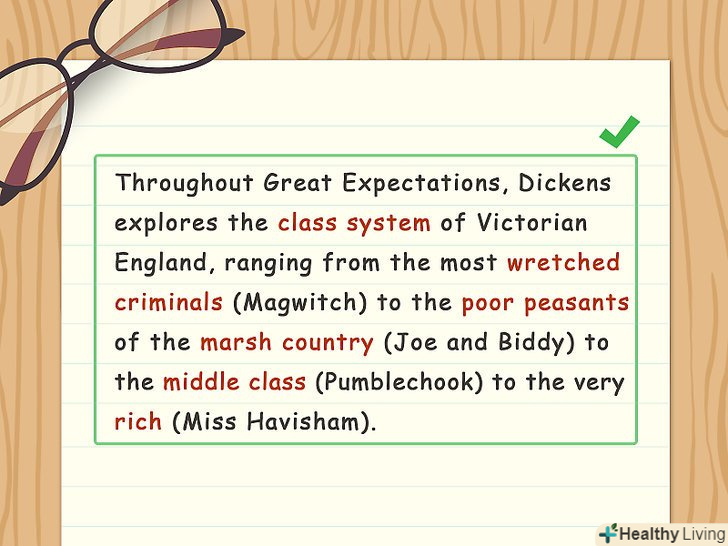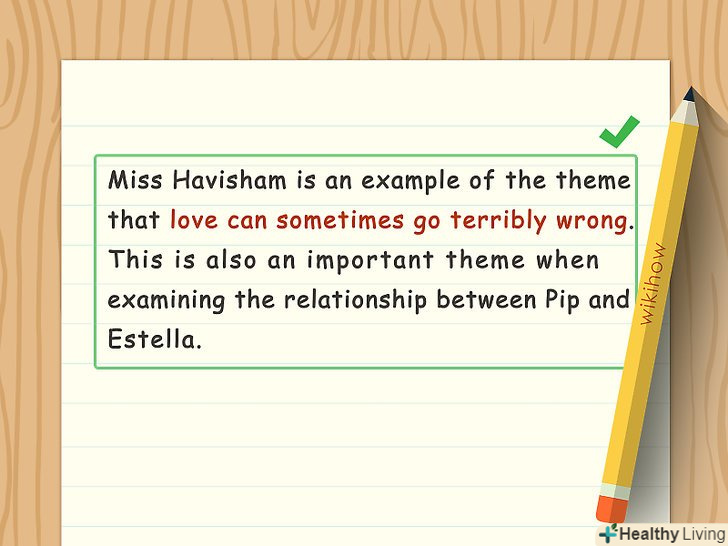 Зв'яжіть приклади з вибраною темою. чітко продемонструйте, як ваші конкретні приклади пов'язані з головною темою. Зотліле вінчальне плаття міс Хевішем символізує скорботу за втраченою любові. Читач оцінить ваші дохідливі пояснення.- Наприклад, напишіть: "міс Хевішем — наочний приклад того, що любов не завжди здатна дарувати радість і щастя. Цей аспект також слід враховувати при вивченні відносин Естелли і Піпа".