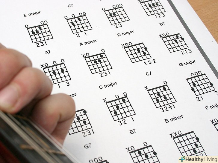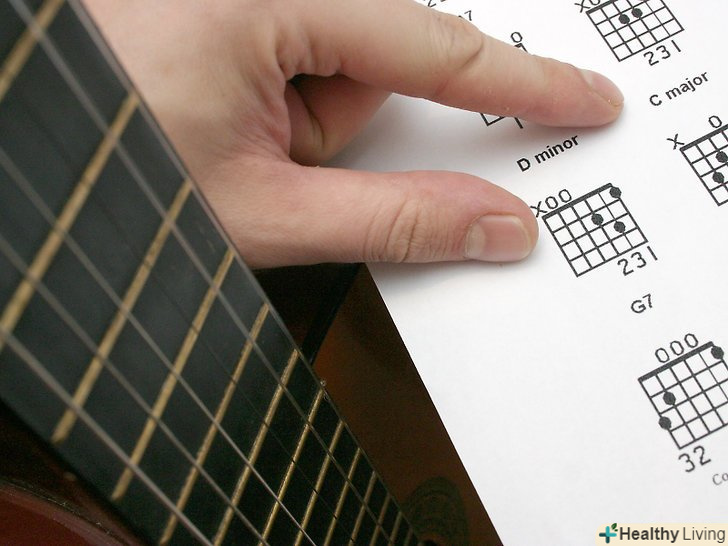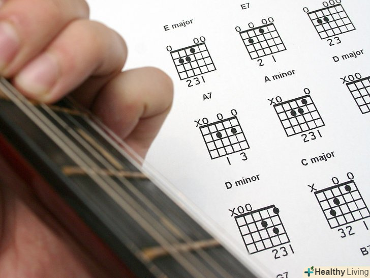 Роздрукуйте схеми акордів .вони чітко показують, куди і які поставити пальці. Це допоможе вам зрозуміти, як повинен виглядати акорд. Намагайтеся звертатися до них, Коли ви уважно вивчаєте відеоролики на Youtube або інші статті Wikihow, тому що вони допомагають вам наочно бачити як виглядає акорд, коли ви його граєте. Зберігайте схеми акордів там, де ви їх можете бачити кожен день – на стіні, на шафі для одягу, або на самій гітарі. Дивлячись на них кожен день, ви будете їх запам'ятовувати. Плануючи грати на публіці, пам'ятайте, що схеми повинні бути надійно приклеєні до гітари.