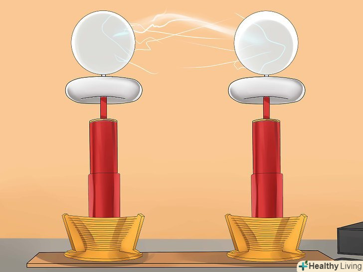 Зберіть всі необхідні деталі. вам знадобиться: трансформатор, Первинний конденсатор високої ємності, розрядник, первинна котушка низької індуктивності, Вторинна котушка з високою індуктивністю, вторинний конденсатор з невеликою ємністю і пристрій для гасіння високочастотних імпульсів, які виникають при високих напругах під час роботи котушки Тесла. Більш детальну інформацію про необхідні деталі ви знайдете в розділі статті"виготовлення котушки Тесла".- Джерело живлення повинен через дросель живити первинний або накопичувальний коливальний контур, який складається з первинного конденсатора, первинної котушки і розрядника. Первинна котушка повинна розташовуватися поруч з вторинною котушкою, яка є елементом вторинного коливального контуру, але контури не повинні бути з'єднані проводами. Як тільки вторинний конденсатор накопичить достатній заряд, він буде випускати електричні розряди в повітря.