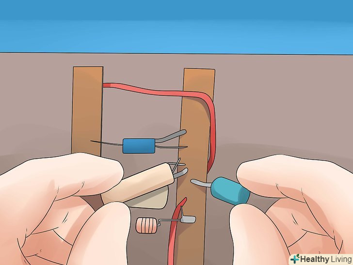 Зробіть Первинний конденсатор.його можна зробити з безлічі маленьких конденсаторів, з'єднаних в ланцюг, які будуть накопичувати рівні частки заряду в первинному контурі. Для цього всі конденсатори повинні мати однакову ємність. Такий конденсатор називається складовим.- Конденсатори малої ємності і навантажувальні резистори можна придбати в магазині радіодеталей або зняти керамічні конденсатори зі старого телевізора. Ви також можете зробити конденсатори з алюмінієвої фольги і поліетиленової плівки.