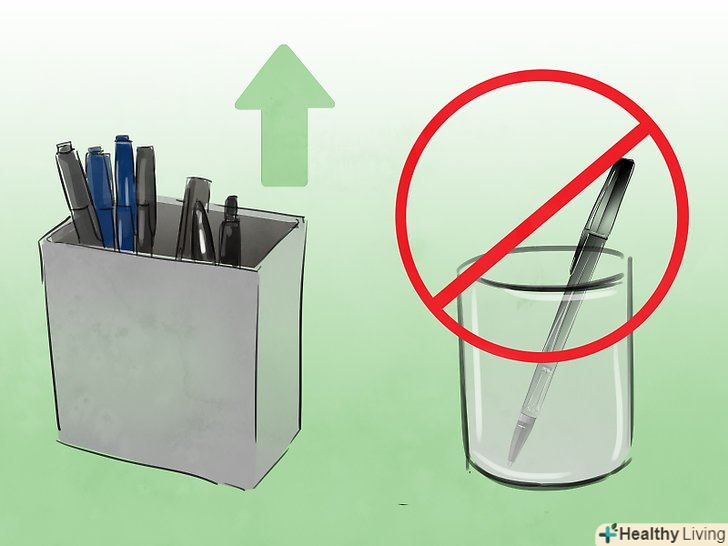 Зберігайте свої ручки і доглядайте за ними належним чином.яку б ручку ви не вибрали, зберігайте її при кімнатній температурі і в спеціальному місці. Тримайте запасні частини або чорнило / стрижні в тому ж ящику, де лежить ручка, або поруч. Щільно закривайте ковпачки. Кладіть ручки горизонтально або складайте вертикально в стакан, щоб вони не протікали.[16]- Слідкуйте за тим, де залишаєте ручки, щоб не втрачати їх.