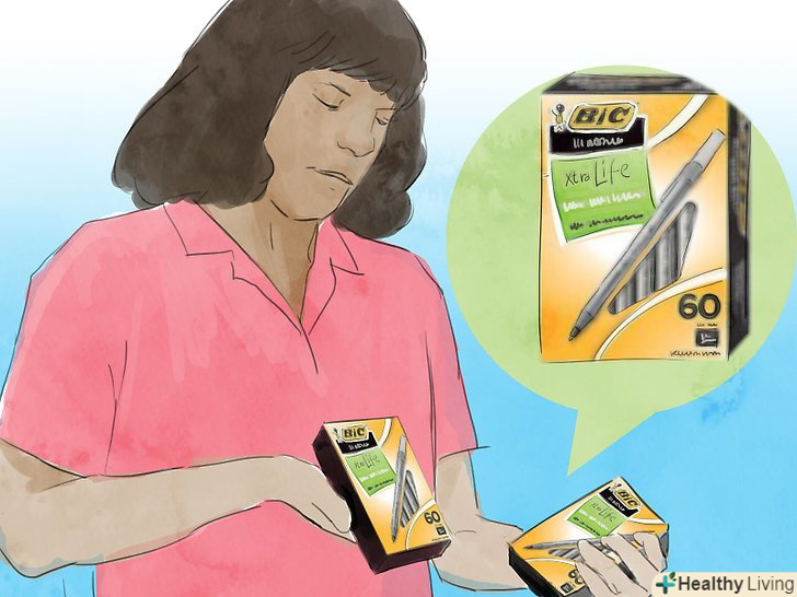 Купуйте улюблені ручки великими упаковками.коли знайдете ручку, яка Вам подобається, купіть упаковку таких ручок, і її вам вистачить надовго. Деякі виробники продають ручки коробками, пакетами або навіть ящиками, що підходить людям, які вважають за краще користуватися одними і тими ж речами. Якщо у вас буде запас ручок, вам не доведеться регулярно купувати нові.- Пошукайте великі упаковки в магазинах дрібного опту або в інтернет-магазинах.
