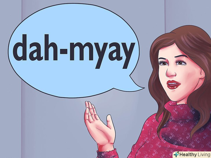 Скажіть слово Damier»dah-myay". після того як ви освоїли ім'я самого лейбла, спробуйте навчитися вимовляти деякі з труднопроизносимы французьких назв продуктів. Для початку, спробуйте вимовити»Damier". Перший склад простий:» dahm «римується з»bomb". Другий трохи складніше: "myay" римується з "play". Не забудьте озвучити I в слові-це "DahMYAY" не»DahMAY".- Майте на увазі, що, французьке закінчення " - ier» майже завжди має тихий звук R.
