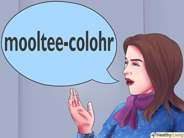 Вимовляєте слово Multicolore»mooltee-colohr". щоб вимовити назву цієї сумки, ви повинні використовувати довгі голосні звуки для кожної голосної, з якою стикаєтеся. Перший склад "mool«, римується з»pool". Наступний " tee " вимовляється, як звучить. Третій склад "col«, звучить як»coal". Нарешті, фінальний склад звучить як "lore", тільки з м'яким, делікатним звуком R, який створюється притисненням задньої частини мови до верхньої частини рота.- Не забувайте, що по-французьки I зазвичай має звук "її» (не" eye " звук). Таким чином, ви ніколи не скажете «mult-EYEcolor».