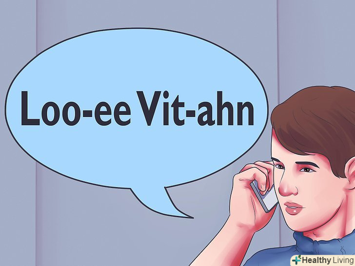 Скажіть "Louie". виходячи з базової англійської вимови "Louis Vuitton", вимовити перше слово — нікчемна справа. Все, що Вам необхідно це сказати англійське чоловіче ім'я "Louie" (як Louis C. K., Louis Armstrong, Louis XIV і т.д.). Це воно! Ніякої додаткової роботи не потрібно.- Корисна інформація: бренд Louis Vuitton названий на честь його засновника, Louis Vuitton, французького ремісника і бізнесмена, який заснував компанію в 1850е роки.[1] Ось чому перше слово з назви компанії можна вимовити просто, як ім'я "Louie", це і є ім'я.