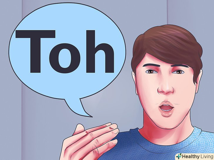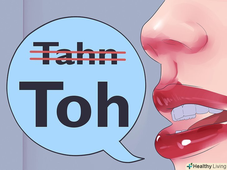 Скажіть "Toh". французькою мовою закінчення "- on", за дуже рідкісним винятком, має тихий звук"N". Це означає, що фактично вам необхідно зробити звичайний звук " О "(як в "low" або "so"). Проте, щоб зробити звук по-справжньому французьким, цю голосну потрібно "прогундосити", вимовляючи її частково вашим знесенням.[3] уникайте підтискання ваших губ, як в англійській мові, при проголошенні звуку»О". Замість цього тримайте ваш рот трохи відкритим, а язик-посеред рота.- Спробуйте цей простий тест, щоб побачити вимовляєте ви "toh" правильно: покладіть палець під вашим носом, ніби ви збираєтеся чхнути, і скажіть слово. Ви повинні відчувати крихітний потік повітря з вашого носа; ці та багато інших французьких слів вимовляються частково носом, що є нормальним для даної мови.[4]