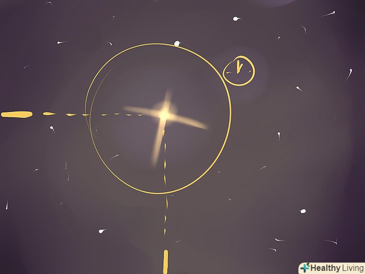 Дізнайтеся, як високо потрібно дивитися. На графіку повинен бути вказаний розділ з назвою " Висота над рівнем моря "з цифрами, перерахованими нижче як" градуси " (або символ градуса - º). У астрономів прийнято розділяти небо на безліч невеликих сегментів, званих градусами, які допомагають знайти місце розташування об'єктів на небі. Значення в 0 º означає лінію горизонту, 90 º-перпендикулярно землі, а 45 º - рівно посередині між 0 º і 90 º. Щоб знайти приблизні позиції між цими значеннями, витягніть руку перед собою і Стисніть долоню в кулак. Відстань між горизонтом і кулаком буде дорівнювати приблизно 10 º. Якщо вам потрібно, наприклад, 20 º, помістіть кулак прямо над лінією горизонту, а кулак іншої руки помістіть зверху. Верхня частина другого кулака буде вказувати на 20º. Продовжуйте змінювати положення кулаків, щоб знайти відповідну позицію.[2]- Може здатися дивним, що станція з'являється прямо посередині неба, а не з-за горизонту. Все через те, що станція стає видимою, тільки коли промені сонця відбиваються від неї. Коли станція виходить з тіні від землі, її тут же стає видно. Станцію погано видно під час заходу сонця або світанку, поки вона не підніметься вище від яскравого сонячного світла.