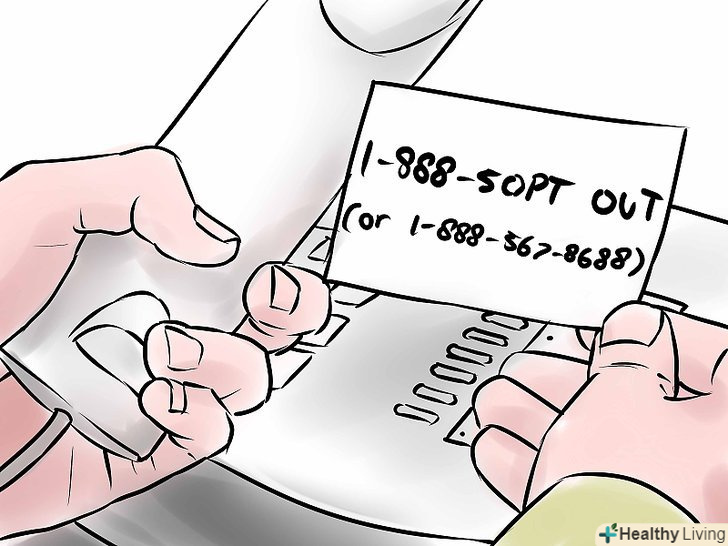 Зателефонуйте за номером 1-888-5 OPT OUT (або 1-888-567-8688).Одного телефонного дзвінка буде достатньо для того, щоб всі чотири основні кредитні установи (в тому числі Equifax, TransUnion, Innovis, і Experian) припинили відправляти пропозиції про оформлення кредитних карт. Слухайте уважно пропоновані автовідповідачем варіанти для того, щоб отримати можливість відмовитися від розсилки на термін до 5 років. Ви також можете вимагати виключити вас зі списків.- Ви також можете зробити запит через онлайн-форму цих установ.[5]