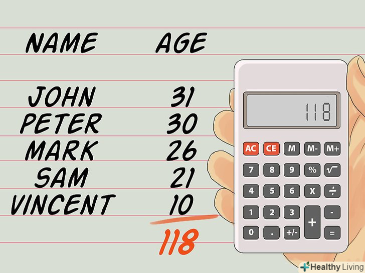 Знайдіть суму всіх записаних віків.для цього складіть всі числа. Наприклад, розглянемо групу з п'яти осіб наступних віків: 31, 30, 26, 21, 10. Сума цих чисел дорівнює 118.[2]
