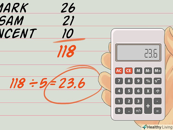 Розділіть отриману суму на кількість чисел (віків).так ви знайдете середній вік. У нашому прикладі розділіть 118 (сума різного віку) на 5 (кількість віків у списку). Середній вік складе 23,6.- Цей метод застосуємо до набору даних з будь-якою кількістю чисел. Наприклад, потрібно знайти середній вік членів клубу. Припустимо, що в клуб вступили 100 осіб. Необхідно з'ясувати точний вік кожного члена клубу. Складіть всі віки, щоб отримати їх суму. Потім цю суму розділіть на 100, щоб обчислити середній вік членів клубу.