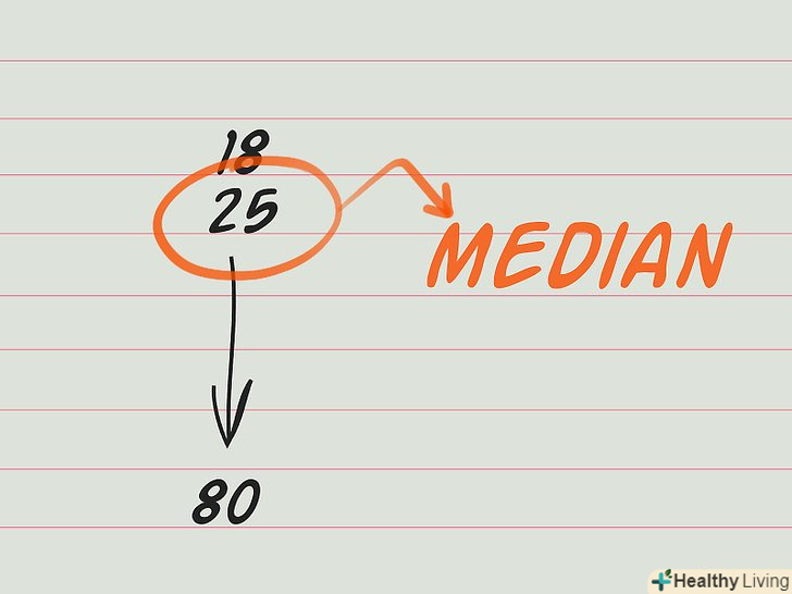 Запам'ятайте відмінність середнього значення від медіани.деякі люди не бачать різниці між середнім значенням і медіаною набору чисел. Насправді в деяких випадках краще обчислити медіану, а не середнє значення.- Медіана-це деяке число набору даних, яке більше однієї половини чисел набору даних і менше іншої половини чисел набору даних. Тобто це число (в нашому випадку вік), яке ділить набір чисел на дві рівні частини.[5].
