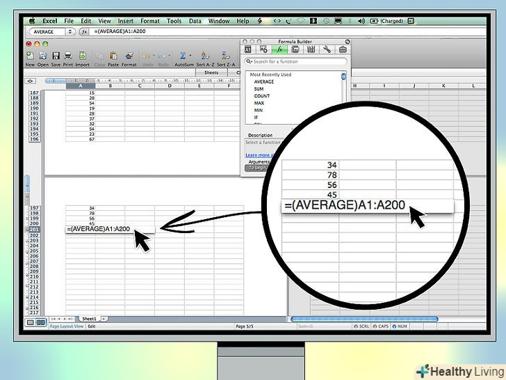 Використовуйте формулу Excel, щоб знайти середнє значення.припустимо, вік введений в комірки стовпця A в рядках з 1 по 200. (Стовпці об'єднують комірки, які розташовані вертикально, а рядки – комірки, які розташовані горизонтально.) Щоб обчислити середнє значення, потрібно ввести відповідну формулу Excel. Її можна ввести в комірці A201.- Формула для обчислення середнього значення в Excel: =(СРЗНАЧ)A1: A200.[8] тут замість A1 потрібно підставити адресу комірки з першим віком. У нашому прикладі перший вік знаходиться в комірці A1, тому що введений в першому стовпці і першому рядку. Замість A200 потрібно підставити адресу комірки з останнім віком.