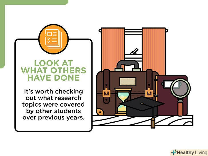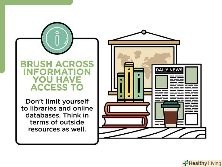 Вивчіть всю інформацію, до якої у вас є доступ.коли у вас буде достатньо цікавих ідей-виберіть ту, яка Вам подобається найбільше, і проведіть невелике попереднє дослідження. Якщо вам вдасться знайти інформацію — яку можна використовувати, - залиште обрану тему; якщо ваші пошуки не приносять результатів, то вам доведеться або стати першопрохідцем, або змінити тему. Не бійтеся прийняти виклик, Якщо інформації по вашій темі недостатньо — часто так йдуть справи саме в сферах, що вимагають найбільшої уваги, а значить, ваш проект як мінімум приверне увагу.[4]- Не обмежуйте сферу своїх пошуків бібліотеками та онлайн-базами даних. Зверніть увагу на інші джерела: першоджерела, Державні установи, освітні телевізійні програми. Якщо ви хочете дізнатися про відмінності в популяції тварин на громадських землях і в індіанських резерваціях-зателефонуйте в резервацію і спробуйте поговорити з їх департаментом рибних водойм і дикої природи.
