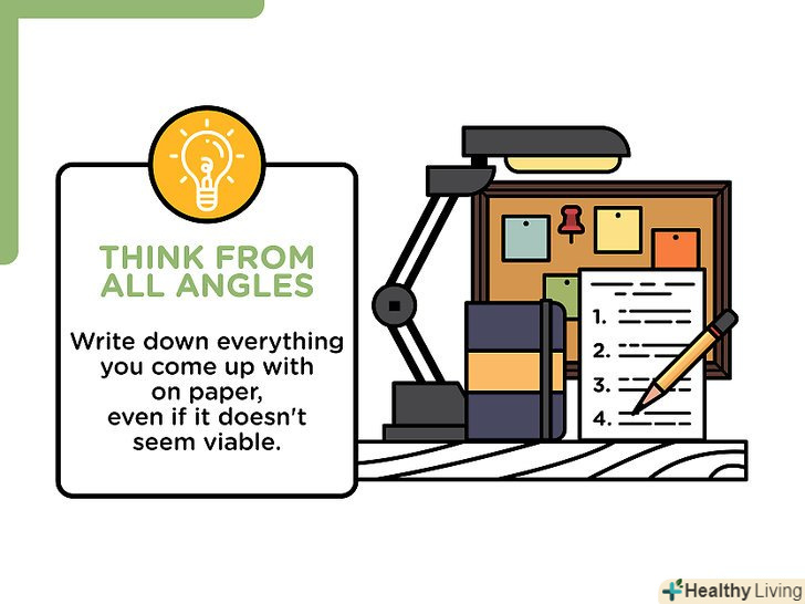 Проведіть мозковий штурм ідей, визначте проблему або питання.незалежно від того, скільки методичних рекомендацій містить завдання, найголовніше в будь-якому науково-дослідному проекті-дозволити досліднику викласти власні ідеї. Потрібно визначити проблему в обраній області, яку потрібно вирішити, або питання, на яке ще не була дана відповідь. На даному етапі ручка і папір - ваші найкращі друзі. Не думаючи про структуру або формат, почніть записувати ідеї — все, що Вам цікаво в межах керівних принципів проекту. На даному етапі важливо пам'ятати-чим цікавіше буде тема для вас, тим простіше ви зможете впоратися з будь-якими труднощами, що виникають у міру роботи над проектом.[1]- Не сумнівайтеся, записувати ідеї чи ні. В кінцевому підсумку у вас на папері може вийти деяка плутанина — дурні або безглузді фрази, які довільно видавав ваш мозок. Це нормально. Поставтеся до цього, як до прибирання павутини з Вашого горища. Через пару хвилин почнуть з'являтися ідеї краще (крім того, ви зможете трохи посміятися над собою).
