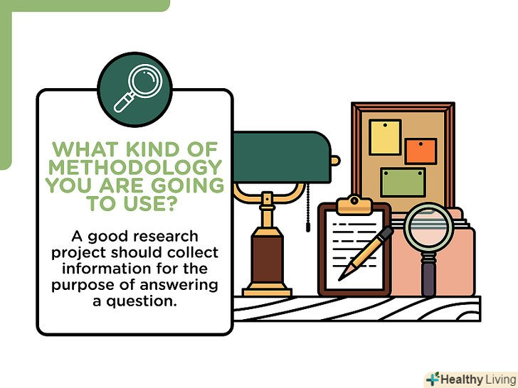 На даному етапі вам потрібно чітко уявляти, якої методології ви збираєтеся дотримуватися при зборі даних.методологія - це основа проекту. Не беріться за роботу, з якою напевно виникне чимало проблем методологічного характеру. Крім того, не беріться за те, що може бути вам не по кишені. У бідних студентів, як правило, немає ні грошей, ні часу, і фінансувати подібні проекти їм доводиться самостійно. Можливо, вам здасться, що ми забігаємо вперед, але в підсумку ви будете раді тому, що не взялися за проект, який просто не змогли б завершити вчасно.- Подумайте в такому ж ключі над питаннями, на які ви хочете отримати відповіді. Хороший науково-дослідний проект повинен служити збору інформації, за допомогою якої можна буде відповісти (або хоча б спробувати) на конкретне питання. Переглядаючи і пов'язуючи між собою різні теми, Ви можете прийти до питань, на які, здається, немає чіткої відповіді. Ці питання і є теми вашого дослідження.