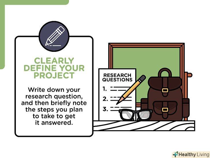 Чітко визначте свій проект. ви звузили сферу пошуку і визначилися з питанням, на яке повинна відповісти ваша науково-дослідна робота-настав час стати трохи більш формальним. Запишіть питання дослідження і коротко позначте кроки, які ви плануєте зробити для того, щоб відповісти на це питання. Після цього внизу сторінки напишіть всі можливі відповіді на тематичні питання. Всього існує три потенційних відповіді: є один шлях( спосіб, результат); є інший варіант; немає принципової різниці між ними.[5]- Якщо ваш план зводиться до "вивчення теми", і ви не можете сказати нічого більш конкретного-запишіть типи джерел, які плануєте використовувати: книги (бібліотечні або особисті?), журнали(які саме?), інтерв'ю і так далі. Попереднє дослідження повинно було допомогти вам зрозуміти, з чого потрібно починати.