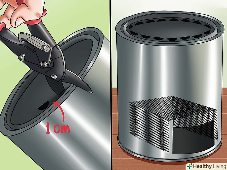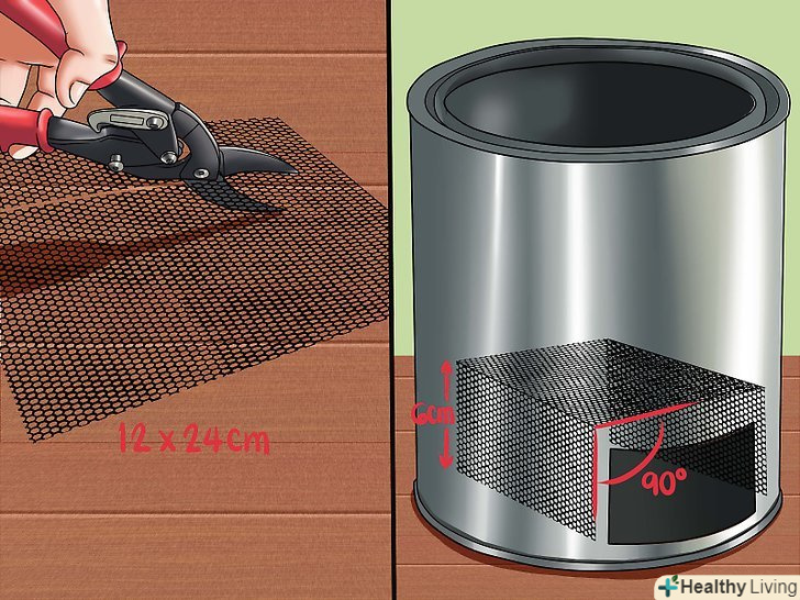 Відріжте смужку металевої сітки 12 x 24 см. по довжині з кожного краю відігніть по 6 см під кутом 90o . У вас вийти квадратна "платформа" 12 x 12 см з двома "ніжками" по 6 см.встановіть її в банку "ніжками" вниз, вирівнявши її по краях прорізаного отвору.