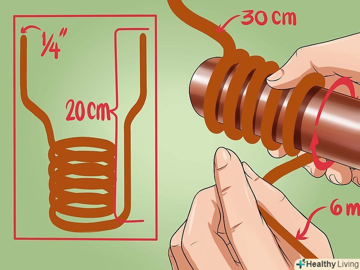 Зробіть змійовик з мідної трубки.візьміть близько 6 м трубки з м'якої міді діаметром 6 мм і відміряйте з одного кінця 30 см. починаючи з цієї точки, виконайте п'ять витків діаметром 12 см. решту довжину труби зігніть в 15 витків діаметром по 8 см. у вас повинно залишитися близько 20 см.