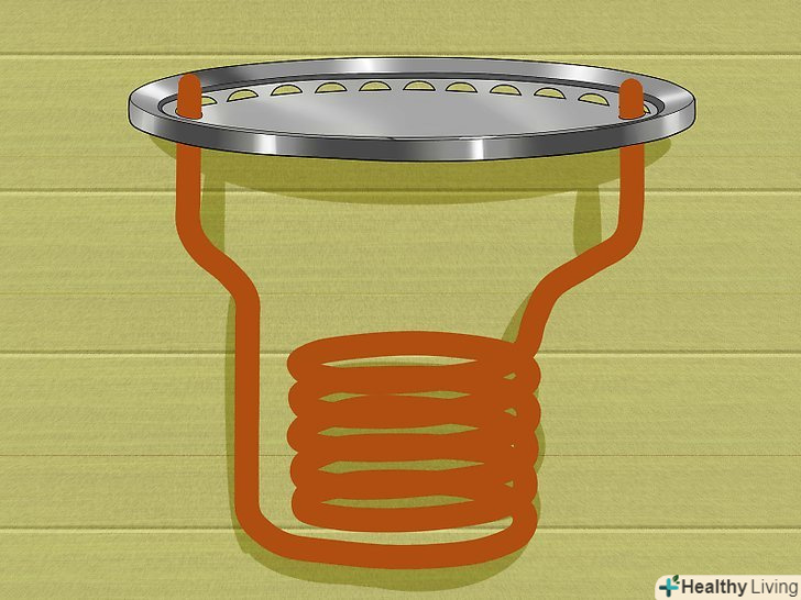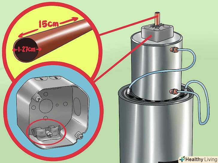 Вставте мідну трубку в сполучну коробку.за допомогою молотка і викрутки видаліть центральну частину круглої металевої ЕЛЕКТРОРОЗПОДІЛЬНОЇ коробки. Зафіксуйте хомут під електричний кабель стопорним кільцем. Вставте 15 см мідної трубки діаметром 1,3 см в хомут кабелю, щоб трубка виходила на кілька сантиметрів нижче отвору в коробці. Затупіть Краю цього кінця всередину за допомогою молотка. Вставте цей кінець трубки в отвір у кришці меншої банки.