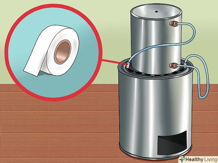 З'єднайте трубку більшої банки з трубкою меншої банки.розмістіть меншу банку над більшою, при цьому трубка з пробкою повинна бути спрямована в протилежну сторону від вентиляційних отворів більшої банки. За допомогою металевої стрічки закріпіть трубку з нижньої пробки з трубкою, що виходить з нижньої частини мідного змійовика. Потім аналогічним чином закріпіть трубку з верхньої пробки з трубкою, що виходить з верхньої частини змійовика.