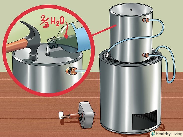 Підготуйте двигун до роботи.зніміть сполучну коробку з меншою верхньої банки і заповніть верхню банку водою, дозволяючи їй виливатися в мідний змійовик, поки банку не буде заповнена водою на 2/3. Перевірте відсутність витоків у всіх місцях з'єднань. Щільно закріпіть кришки банок, застукавши їх молотком. Знову встановіть сполучну коробку на місце над меншою верхньою банкою.