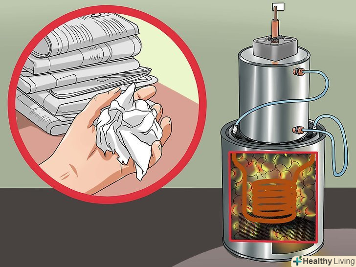 Запускайте двигун!Скомкайте шматки газети і покладіть їх в простір під сіткою в нижній частині двигуна. Коли деревне вугілля розгориться, дайте йому прогоріти близько 20-30 хвилин. У міру нагрівання води в змійовику у верхній банці почне накопичуватися пар. Коли пар досягне достатнього тиску, він виштовхне дюбель і шпажку наверх. Після скидання тиску поршень опуститься вниз під дією сили тяжіння. При необхідності, зріжте частину шпажки, щоб знизити вагу поршня – чим він легше, тим частіше буде "спливати". Постарайтеся зробити шпажку такої ваги, щоб поршень "ходив" в постійному темпі.- Можна прискорити процес горіння, посиливши приплив повітря в вентиляційні отвори феном.
