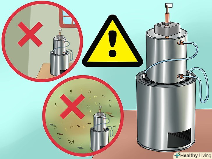 Дотримуйтесь безпеки.вважаємо, само собою зрозуміло, що при роботі і поводженні з саморобним паровим двигуном необхідно дотримуватися обережності. Ніколи не запускайте його в приміщенні. Ніколи не запускайте його біля таких займистих матеріалів, як сухе листя або нависають гілки дерев. Використовуйте двигун тільки на міцній негорючій поверхні на зразок бетону. Якщо ви працюєте з дітьми або підлітками, то вони не повинні залишатися без нагляду. Дітям і підліткам забороняється підходити до двигуна, коли в ньому горить деревне вугілля. Якщо вам не відома температура двигуна, то вважайте, що він настільки Гарячий, що до нього не можна торкатися.- Переконайтеся, що пара може виходити з верхнього "котла". Якщо з якої-небудь причини поршень застрягне, то всередині меншої банки може накопичитися тиск. При найгіршому розкладі банку може вибухнути, що дуже небезпечно.